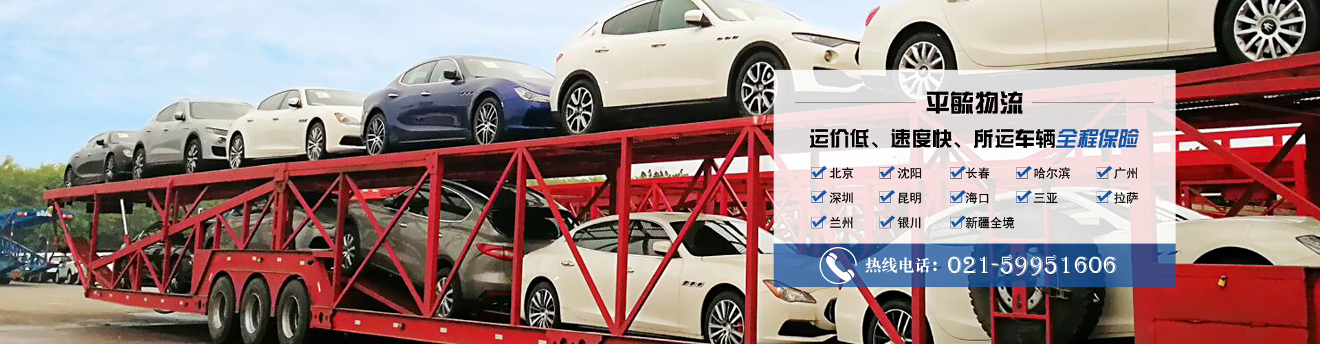 上海平毓物流有限公司:主要以試驗車巡展車、二手車、私家車、事故車、特大型疑難車型的托運業務,北京、沈陽、長春、哈爾濱快速到達。運價低,所運車輛全程保險,運輸車輛全部衛星定位。我們擁有一支強大的運輸隊伍,管理系統實行計算機網絡化,信息化管理。保證了快速、準確及時快捷的運輸任務。